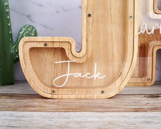 This wooden piggy bank features a letter shape based on your childβs name initial. It provides a simple way for children to store coins or pocket money while adding a personalized touch to their space.